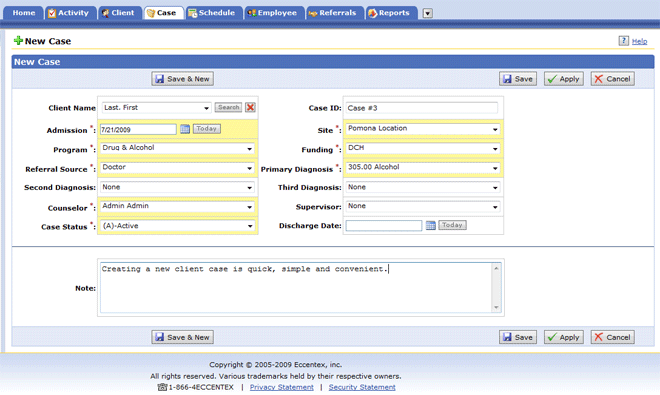 Creating a new case automatically attaches it to a selected client and assigns a "case ID". Here, you may specify the counselor assignment, source of funding, treatment facility location, initial diagnosis, case status and other information. A space for Notes enables you to make sure that all additional comments and reminders get saved for later viewing.